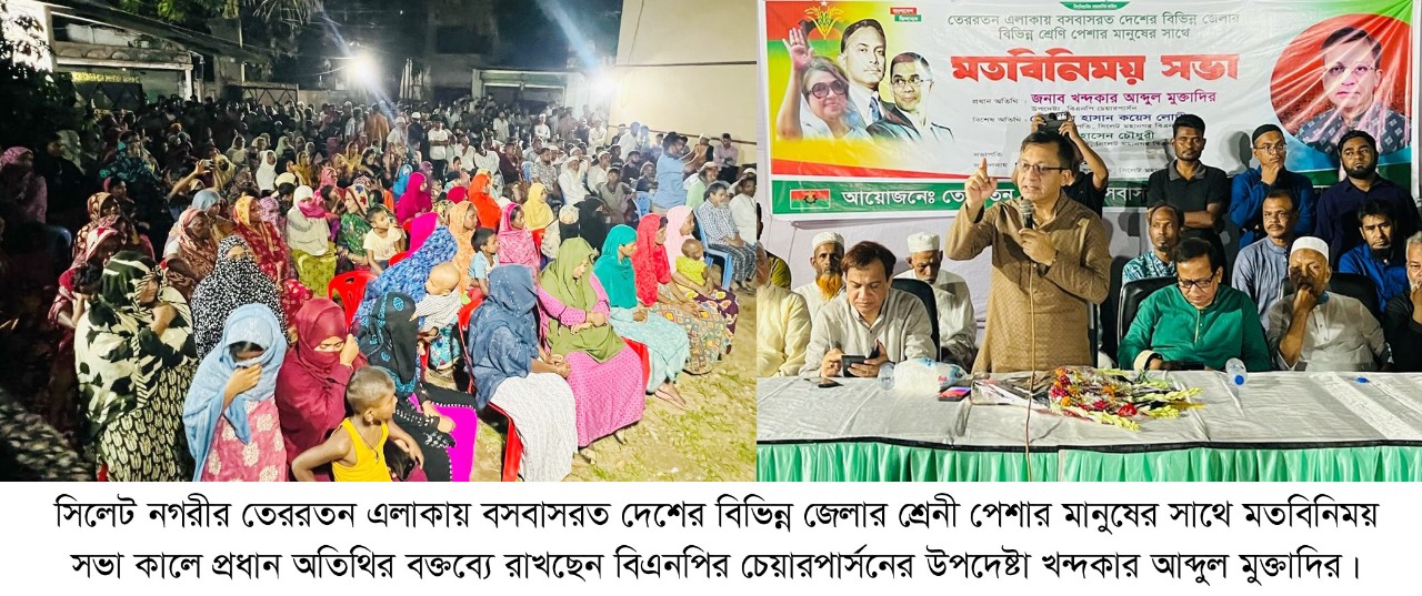 তিনি সোমবার (১২ মে) সিলেট নগরীর তেররতন এলাকায় বসবাসরত দেশের বিভিন্ন জেলার শ্রেনী পেশার মানুষের সাথে মতবিনিময় সভা কালে প্রধান অতিথির বক্তব্যে উপরোক্ত কথাগুলো বলেন। মতবিনিময় সভায় বিশেষ অতিথি হিসেবে বক্তব্য রাখেন মহানগর বিএনপির ভারপ্রাপ্ত সভাপতি রেজাউল হাসান কয়েস লোদী ও সাধারণ সম্পাদক ইমদাদ হোসের চৌধুরী।